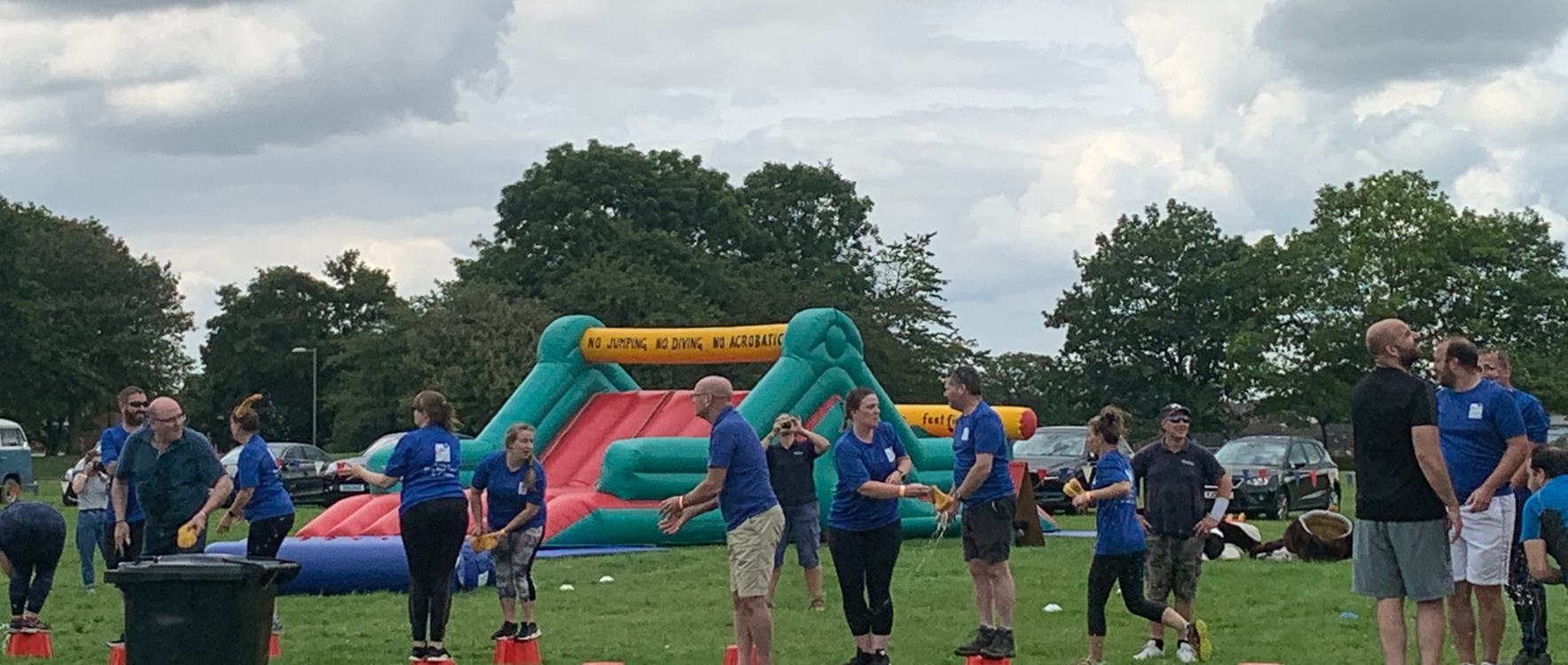KiriLynn tells us how the day went:The six games included:Castle sponge challenge - throwing sponges to each other and then over the castle to the catcher who had to wring them out to collect the water, the most water in the bucket wins. Mary Hare teams challenged each other and Team 1 just beat Team 2! Bouncy relay - where three people had to jump on a large space hopper together in a relay race - Team 2 smashed this! They were fantastic. Team 1 couldn't do this, and Mr Britten ended up just dragging us over the finish line! Up and over - had lots of foam and water . We had to get all the teams over as many as possible. It was so difficult we only managed to get four of our team over it! Whereas Team 2 again smashed it - they were super-fast and competitive! Giants (from the original tv show) - We had to dress up a team member in a giant costume with huge shoes and plod along the mats (but the mats were being pulled from underneath you). Adam Wilks was super-fast and only fell over twice whereas Paul in Team 2 came last and kept falling over. Liesl and Ed were trying to help him but it didn't work! Penguins was a penguin tag sumo race. Dressed up in a penguin outfit you had to run around and push out your opponents. Ed was great at this and won his round. Rebecca however went down and was out after two attempts! Water obstacle involved wearing a builder's hat with a pint of water running over the obstacle course hurdles whilst trying not to spill the water!! Great fun to end the day and we got very wet!! Team 1 did well at this one
